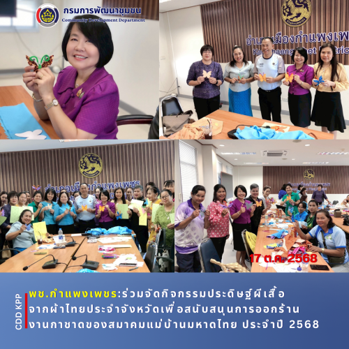 นางสาวสิริกร นิลกำแหง พัฒนาการจังหวัดกำแพงเพชร ร่วมการจัดกิจกรรมประดิษฐ์ผีเสื้อจากผ้าไทยประจำถิ่นของจังหวัดฯ เพื่อสนับสนุนการออกงานกาชาดของสมาคมแม่บ้านมหาดไทยประจำปี 2568 โดยมีนายอนุชา พัสถาน รองผู้ว่าราชการจังหวัดกำแพงเพชร นายอำเมืองกำแพงเพชร ผอ.กลุ่มงานส่งเสริมการพัฒนาชุมชน พัฒนาการอำเภอเมืองกำแพงเพชร เจ้าหน้าที่พัฒนาชุมชน และคณะกรรมการพัฒนาสตรี เข้าร่วมกิจกรรม