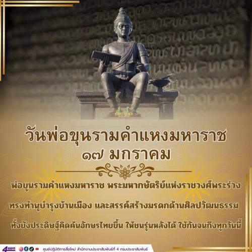 พ่อขุนรามคำแหงมหาราช หรือ ขุนรามราช หรือ พระบาทกมรเตงอัญศรีรามราช ทรงเป็นพระมหากษัตริย์ไทยพระองค์ที่ 3 แห่งราชวงศ์พระร่วง (อาณาจักรสุโขทัย) ทรงครองราชย์ประมาณ พ.ศ. 1822 ถึงประมาณ พ.ศ. 1842 พระองค์ทรงเป็นกษัตริย์พระองค์แรกของไทยที่ได้รับการยกย่องเป็น “มหาราช” ด้วยทรงบำเพ็ญพระราชกรณียกิจอันทรงคุณประโยชน์แก่แผ่นดิน ทรงรวบรวมอาณาจักรไทยจนเป็นปึกแผ่นกว้างขวาง ทั้งยังได้ทรงประดิษฐ์ตัวอักษรไทยขึ้น เมื่อปี พ.ศ.1826 อันเป็นต้นกำเนิดของอักษรไทยที่ใช้กันทุกวันนี้ ทำให้ชาติไทยได้สะสมความรู้ทางศิลปะ วัฒนธรรม และวิชาการต่าง ๆ สืบทอดกันมายาวนาน ทรงสร้างสรรค์มรดกทางศิลปะและวัฒนธรรมสำคัญของชาติไว้ ทรงคิดประดิษฐ์อักษรไทย ทั้งนี้ ในมติคณะรัฐมนตรี เมื่อวันที่ 5 ตุลาคม 2553 ได้กำหนดให้วันที่ 17 มกราคมของทุกปี เป็นวันพ่อขุนรามคำแหงมหาราชและเป็นวันรัฐพิธี โดยให้มีการวางพานพุ่มถวายราชสักการะและไม่ถือเป็นวันหยุดราชการ